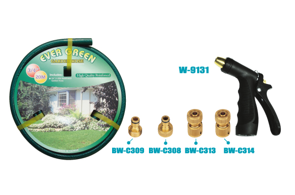 GH-415-9131Bは、1/2インチ(約1.5cm)の強化ホース(15m)を備えた高品質な散水セットです。5ピースの調整可能な真鍮ヘッドピストルガンセットと、耐久性の高い真鍮製コネクタ(BW-C309、BW-C308、BW-C313、BW-C314)が付属し、あらゆるガーデニング作業において、長寿命で正確な散水性能を保証します。