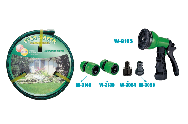 GH-615-9105は、3/4インチ(約15メートル)の強化ガーデンホースを備えたプレミアム散水キットです。7種類の散水パターンに対応する多用途プラスチック製スプレーガンと、4種類の必須コネクタ(W-3140、W-3130、W-3084、W-3090)が付属し、屋外での灌水や清掃作業に耐久性と総合的なソリューションを提供します。