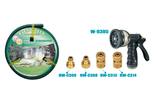 GH-615-9305Bセットには、15メートルの強化3/4インチガーデンホースと9パターンのアルミ製スプレーガンが含まれています。このプロフェッショナルキットには、耐久性の高い真鍮製コネクタ4個(BW-C309/308/313/314)が付属し、ガーデニングや屋外清掃のあらゆる作業に信頼性と汎用性に優れた散水ソリューションを提供します。